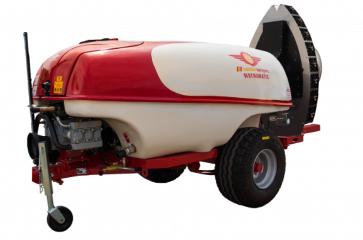 Sprayer for taller trees, higher crown density, greater inter-row width. Especially for large traditional olive, almond and walnut farms with difficult terrain.