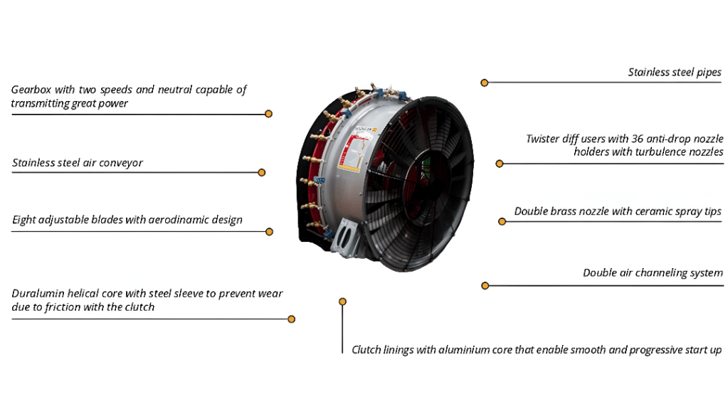 Specifically designed for citrus, fruit tree, olive, and almond orchards, this sprayer is equipped with a double air channel system that ensures optimal coverage and deep penetration throughout the canopy. The dual airflow design maximises efficiency by delivering consistent, uniform treatment across all sides of the tree, reducing drift and improving spray precision.
