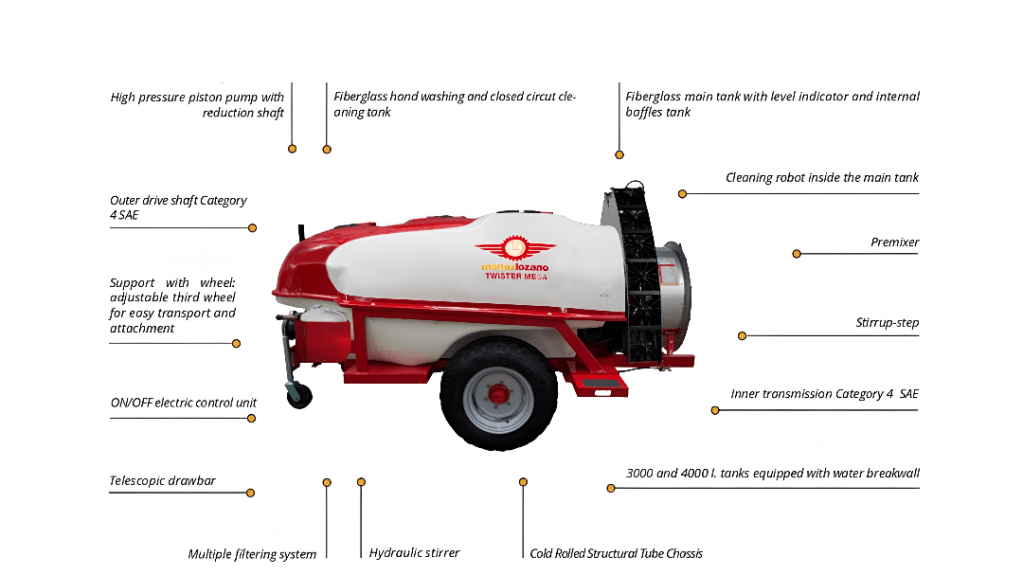 Designed for orchards with high canopies, dense foliage, and wide inter-row spacing, this sprayer delivers powerful and consistent performance in demanding agricultural environments. Ideal for use with semi-standard tractors, it is perfectly suited for large farms and rough or uneven terrain, maintaining excellent stability and precision across all operating conditions.