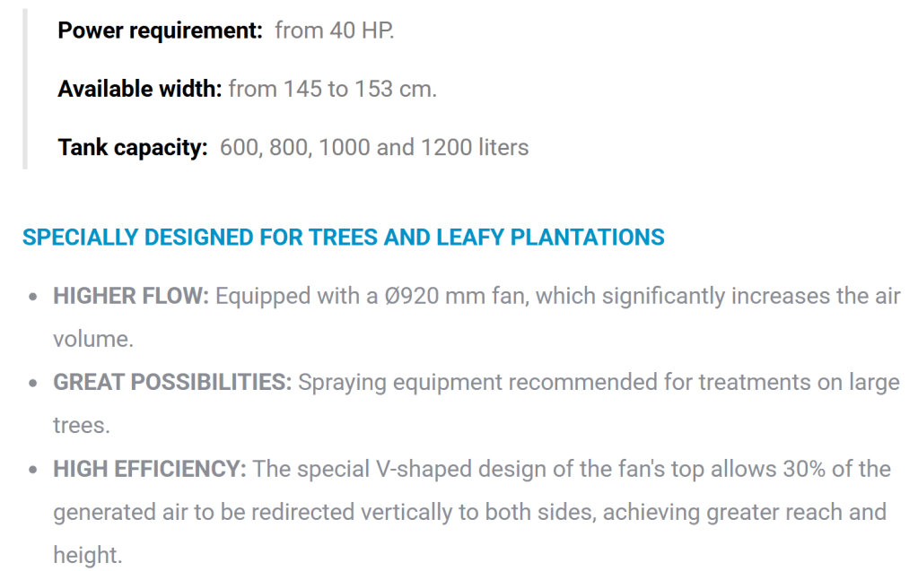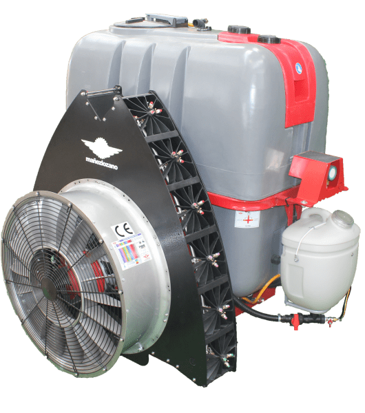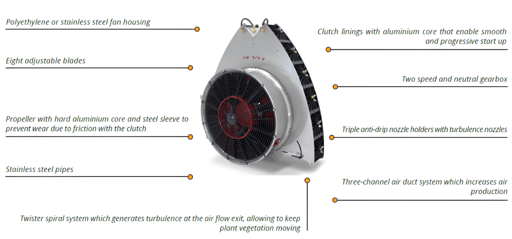 Twister diffusers produce a turbulent, spiral-shaped airflow that moves the leaf mass, avoiding the shielding effect and effectively penetrating the interior of the tree.