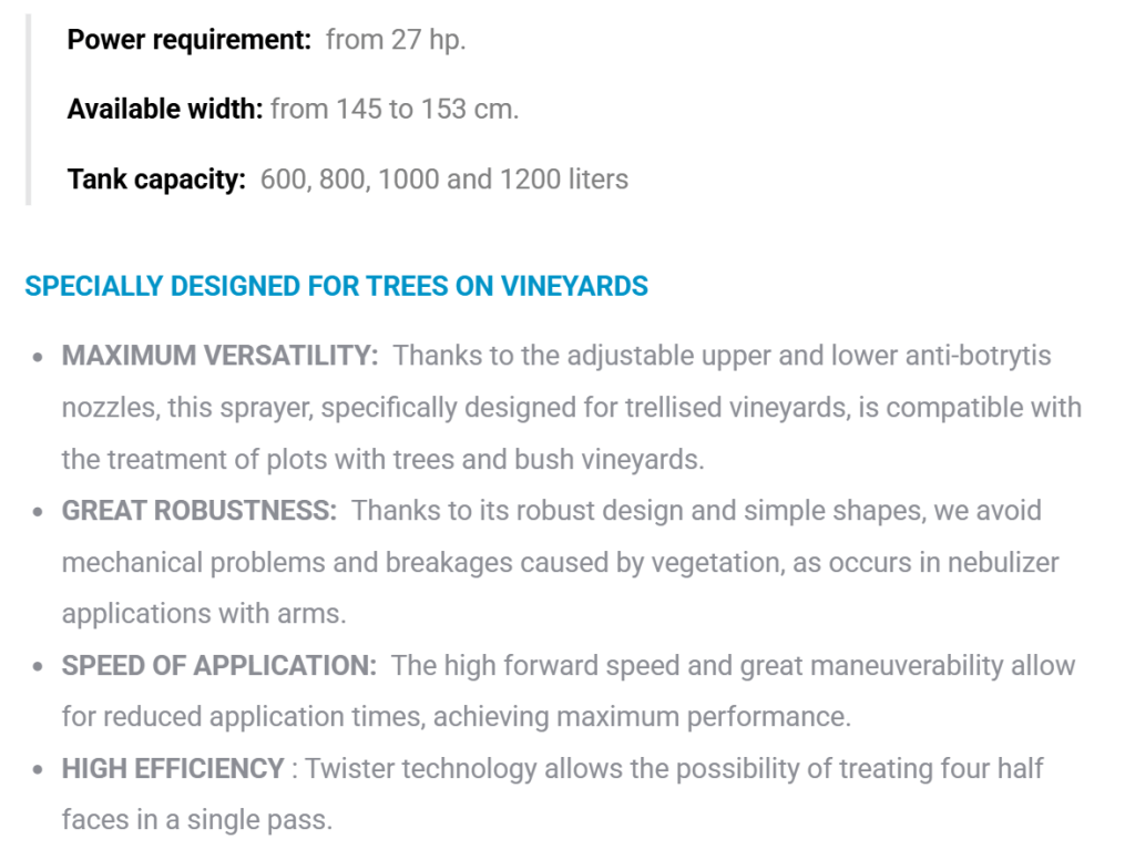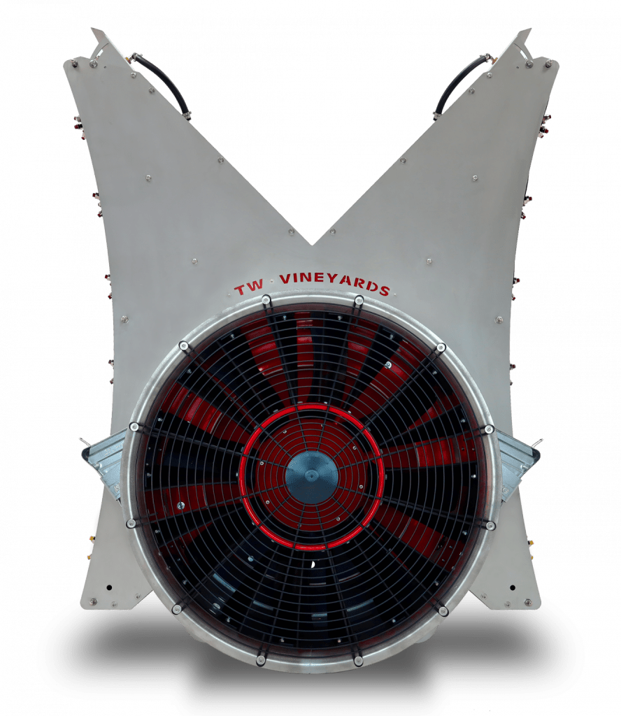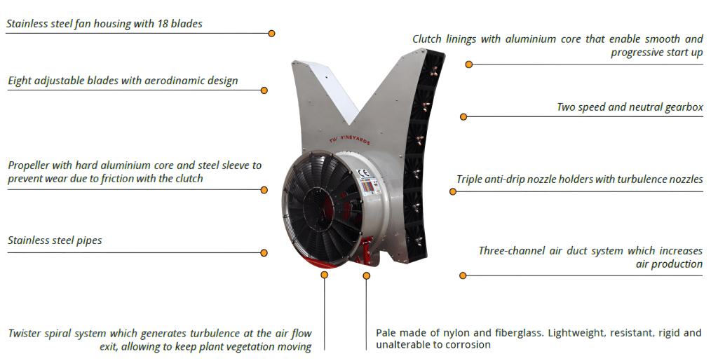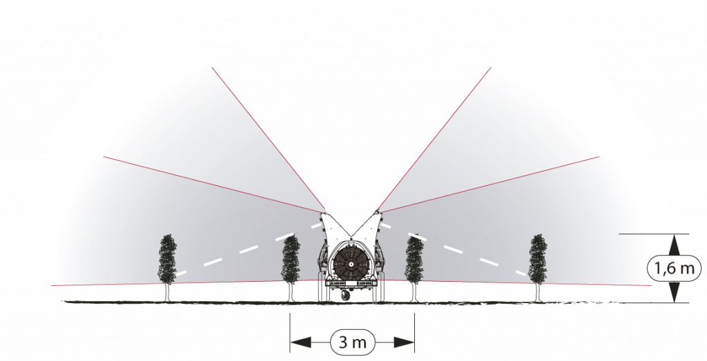 Twister diffusers produce a turbulent, spiral-shaped airflow that moves the leaf mass, avoiding the shielding effect and effectively penetrating the interior of the tree.